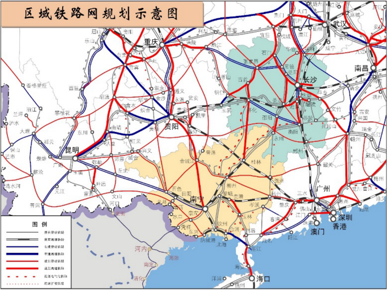 懷桂高鐵北接懷化鐵路樞紐,聯(lián)通既有的滬昆高鐵和正在建設(shè)的張吉懷高鐵,南連桂林、南寧。已于2016列入國家《中長期鐵路網(wǎng)規(guī)劃》規(guī)劃研究項(xiàng)目,也是《國家綜合立體交通網(wǎng)規(guī)劃綱要》二湛通道內(nèi)的遠(yuǎn)期規(guī)劃研究項(xiàng)目。懷桂高鐵為張吉懷鐵路南延線和二湛通道的最南端,與滬昆高鐵一起緊密聯(lián)系長株潭城市群、成渝雙城經(jīng)濟(jì)圈、關(guān)中平原城市群、長江經(jīng)濟(jì)帶、北部灣城市群、粵港澳大灣區(qū),是構(gòu)筑湘、桂、瓊、粵四地區(qū)北上、南下、西進(jìn)、東出的重要通道,是西部陸海新通道東線的重要組成部分,是西部和華南地區(qū)與東盟連接的重要紐帶,對促進(jìn)我國中西部地區(qū)內(nèi)外連通、通邊達(dá)海具有非常重要的戰(zhàn)略意義。