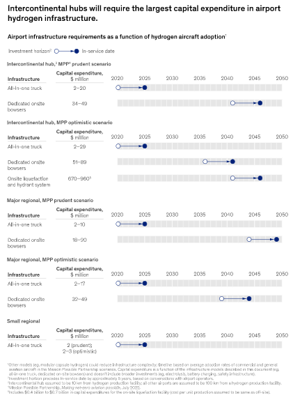 隨著對解決航空業氣候影響的解決方案的尋求變得更加迫切,人們對例如氫氣、電池電力和混合電力驅動飛機等新型推進技術產生了極大的興趣。根據MPP對航空業能源的估計,到2050年,電池電力和氫動力飛機可能占所有飛機的21%-38%,占該行業整體能源需求的15%-34%。雖然時間上可能感覺很遙遠,但這一新技術將在這十年內出現。 針對這些基礎設施的變化,以及機場和其他利益相關方如何開始準備,仍存在不確定性。近期,麥肯錫發布了《瞄準低碳:為電池和氫動力飛機提供基礎設施》的報告,旨在幫助人們了解影響新型推進器的一些關鍵考慮因素。