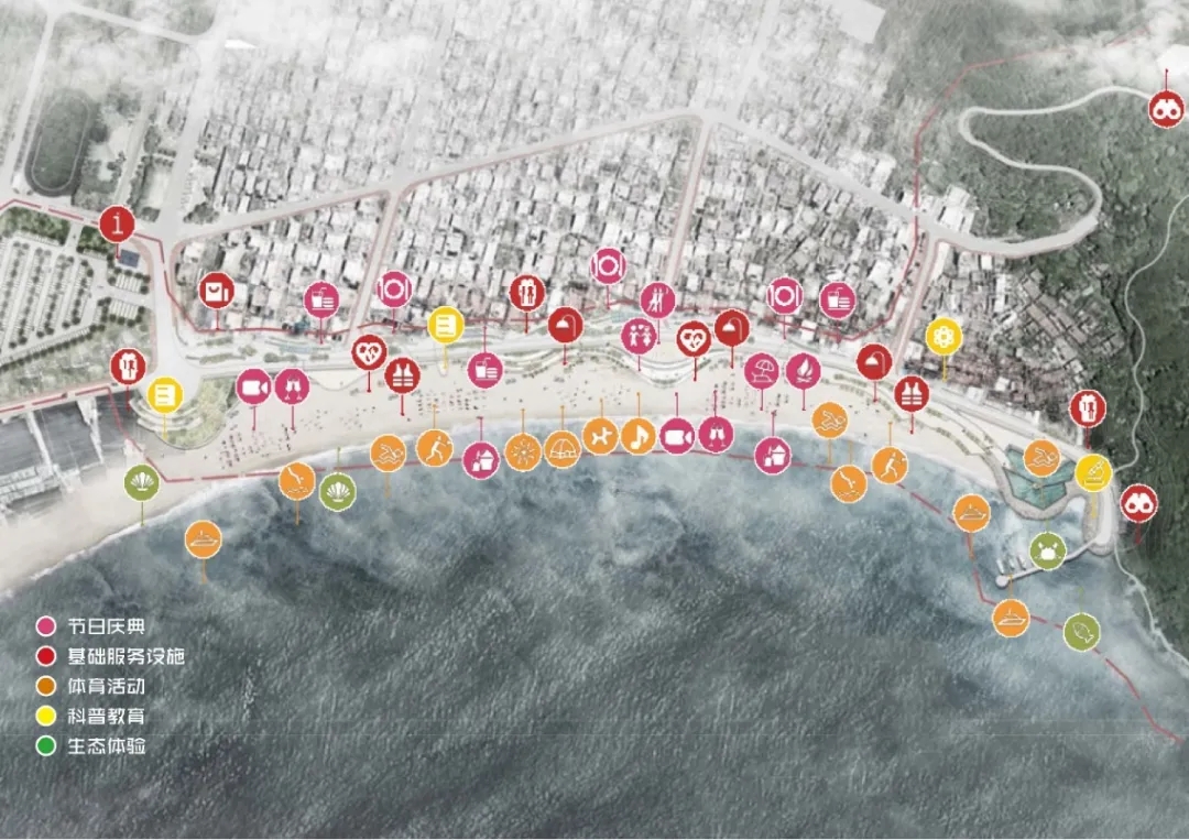 設計團隊為滿足多節點、多層次、多樣性的旅游和生產生活需求,在時間上,堅持“全季節、全天候”的產業項目策劃,遵循當地漁業作息規律,引導游客、村民進行濱海技藝觀賞和節慶互動;在空間上,融合“山-陸-海-島”的聯動發展模式,將海上娛樂、商業服務、自然觀光相結合,塑造山海一體的澳角村度假品牌形象。