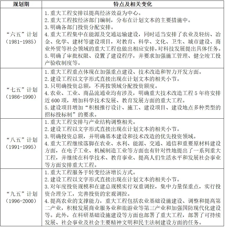 表2 “六五”至“九五”計劃中的重大工程特點